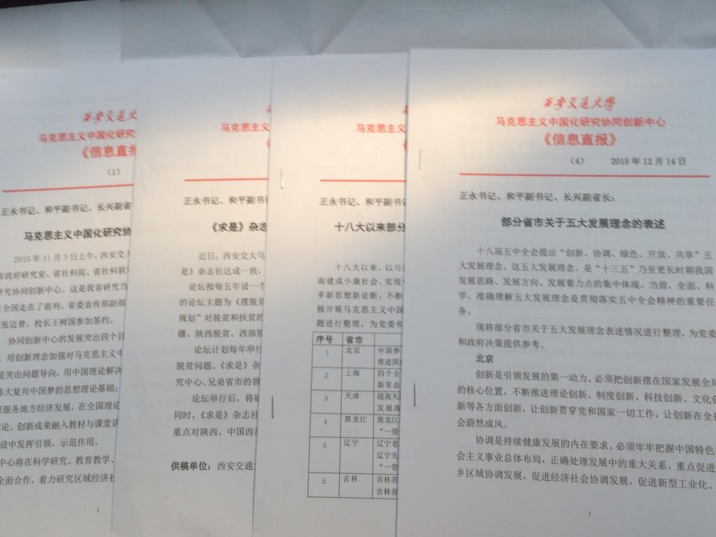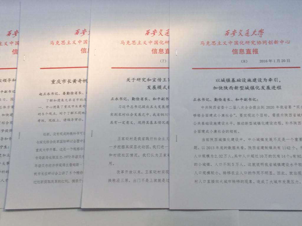 马克思主义中国化研究协同创新中心紧紧围绕国家发展重大需求特别是陕西经济社会发展重大现实问题开展应用对策研究,发挥智库的决策咨询作用。围绕陕 西经济社会发展,就陕西“十三五”发展重大问题、陕西省城镇职工基本养老保险基金的长效运营机制、基于绿色发展理念引领下的美丽陕西建设、陕西现代农业的 政策支撑和服务体系等开展研究。协同创新中心先后向陕西省委省政府主要领导报送多期《信息直报》。