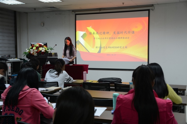 随后,支部成员就西迁精神的学习进行了充分的自由讨论。姜晓婷同志从西迁的物化体现——梧桐树谈起,分享了西迁过程中交大老教授们的感人事迹。束坤翼同志围绕十六字的西迁精神逐点展开,共勉大家要高眼界,善奉献,能吃苦。作为交大学子,树立大局观念,站在民族、国家发展的角度不断超越自我、服务社会。崔殿宁同学首先谈了西迁精神在交大精神中独树一帜的地位,肯定了交大在不同时期的发展定位,并表达了对交大争创世界一流大学的信心。武星星同学强调在深化“服务大局”意识的同时要深度挖掘团结精神,把西迁精神内化为自我发展的动力。王换同志则从理论高度出发,将西迁精神与“三严三实”精神、社会主义核心价值观相结合。随后,支部其他成员分别谈了自身对西迁精神的学习体会。