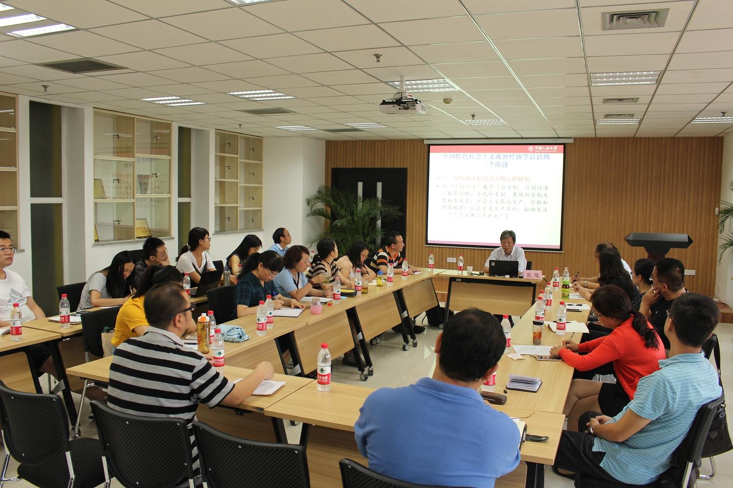 张旭教授首先回顾了社会主义政治经济学近百年的理论探索和发展历史,特别是中国特色社会主义政治经济学话语发展演变的三个阶段,即以传统计划经济为核心的研究阶段、以有计划的商品经济体制为核心的研究阶段和以社会主义市场经济体制为核心的研究阶段;立足于社会主义政治经济学理论发展的历史探索和基本经验,着重讲解了当前中国特色社会主义政治经济学话语构建需要回答的主要问题,以及发展中国特色社会主义政治经济学的思路和路径。在论坛的交流互动阶段,参加论坛的师生围绕中国特色社会主义政治经济学理论创新、当前中国经济改革发展现实问题与张旭教授进行了热烈交流和讨论。