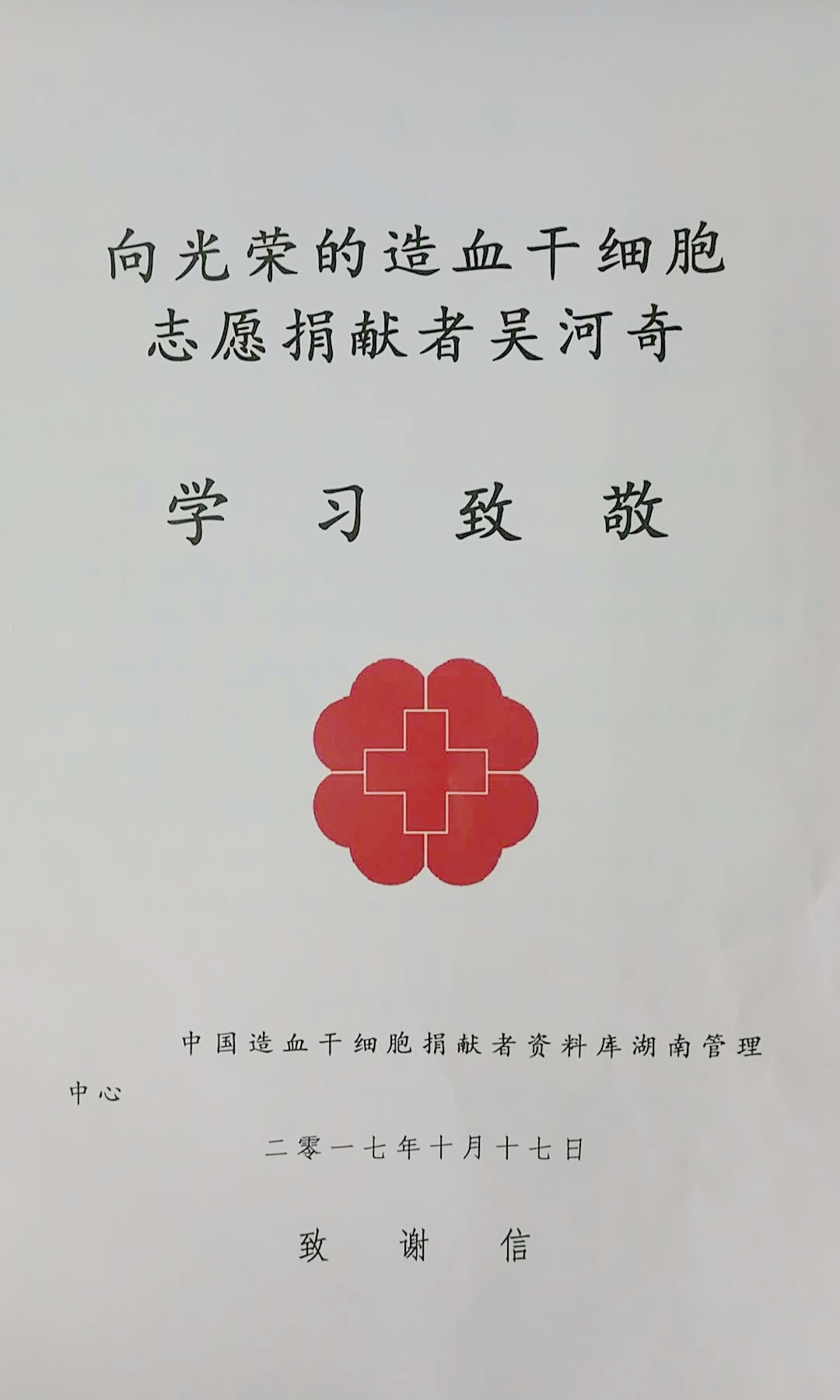 发来了关于公休前往捐献的函和一封“致谢信”——“向光荣的造血干细胞志愿捐献者吴河奇学习致谢”。2014年5月在基层做村官期间,吴河奇志愿报名加入了中国造血干细胞捐献者资料库。今年5月23日,与一名求助的白血病患者初配型结果相合。8月3日,经过取样5ml的血液样本高分辨检验,确定为“结果相合”,符合捐献条件。一月后,按照流程通过了体检,并通知于2017年10月31日—11月1日正式前往湖南为指定患者捐献造血干细胞。