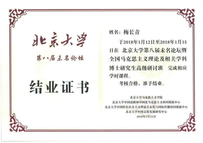 2017级博士研究生梅长青同学的投稿论文被选中,作为陕西唯一受邀的博士生参加了此次论坛,按时完成了相关课程学习、考核合格、顺利结业,获得北京大学 色情影片