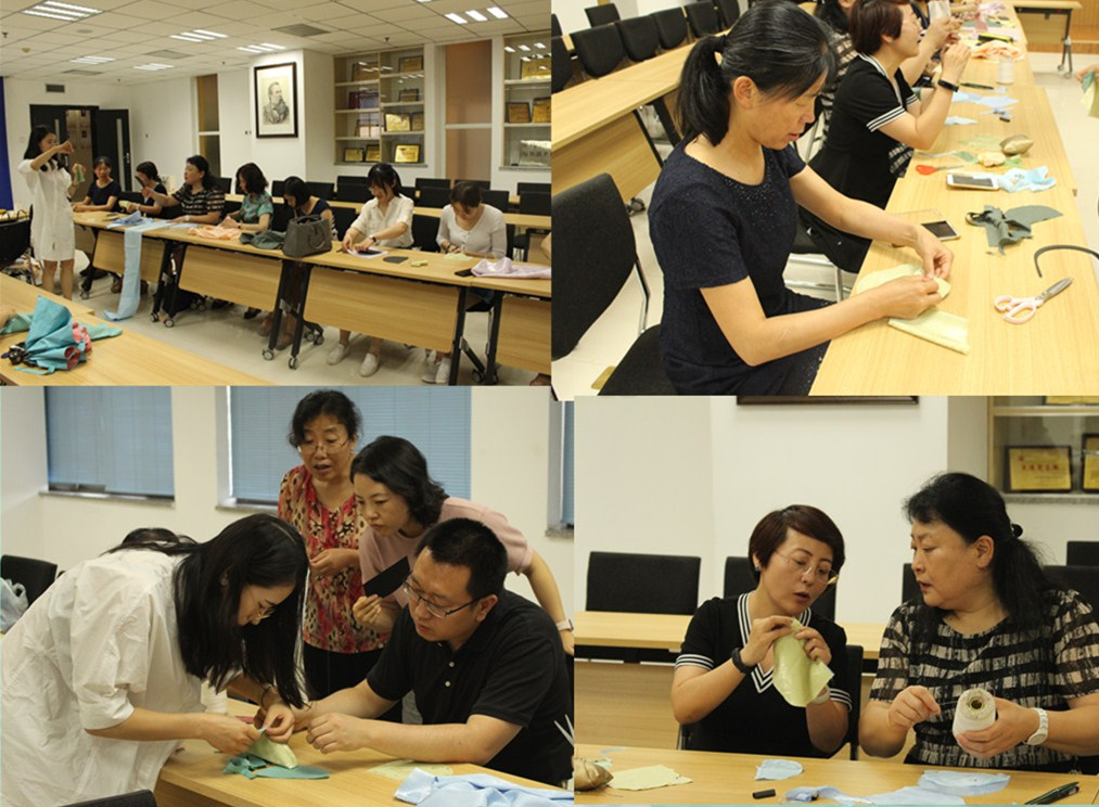 工会特别邀请民间非物质文化遗产的手工艺人来学校,手把手教老师们缝制爱心香包。