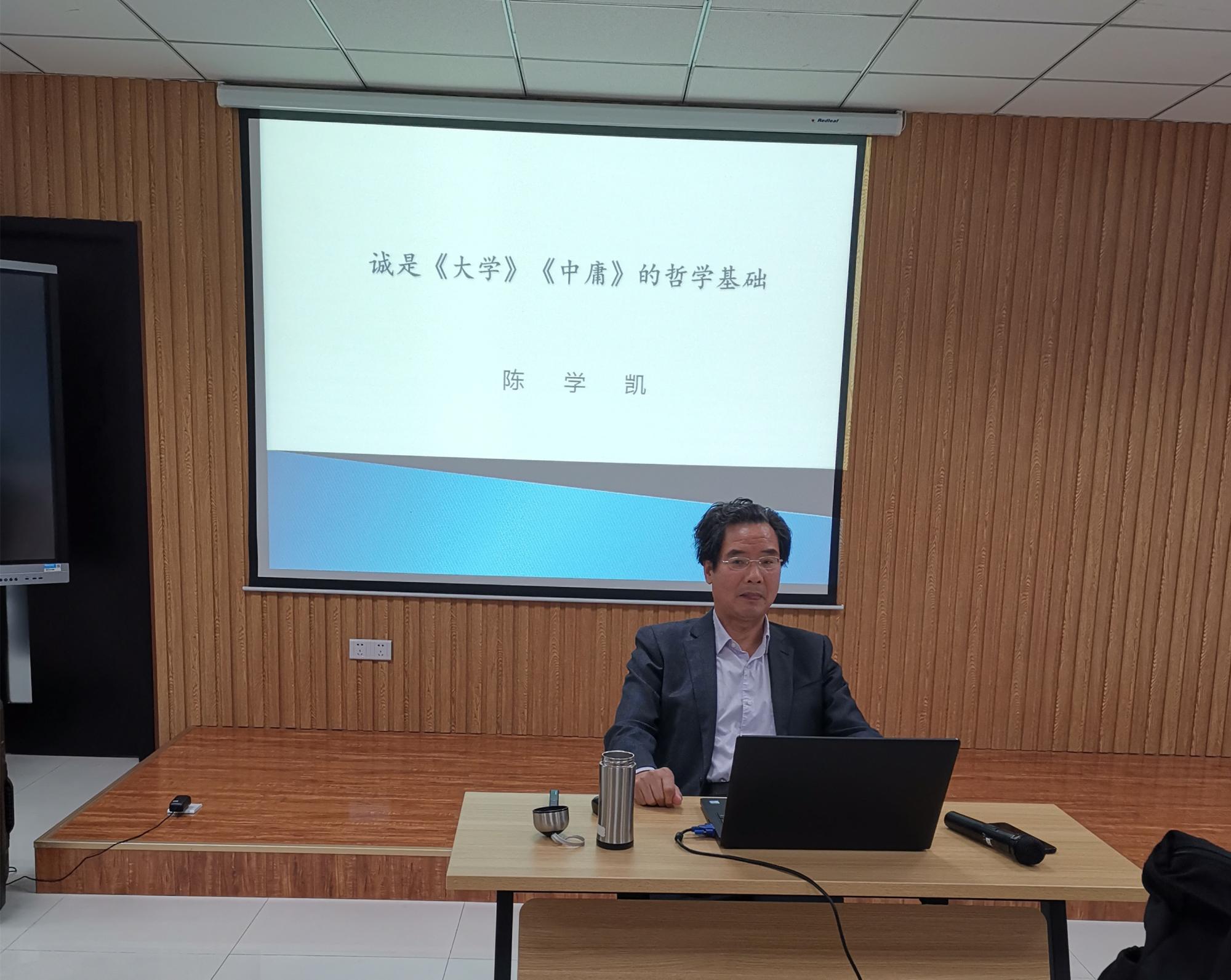 陈学凯教授长期从事中国思想史、中国哲学史、中国古典军事学、中国传统文化与中国古典戏曲等领域和问题的研究,著有《正统论与革命观——中国传统政治文化的调节机制》、《制胜韬略:孙子战争知行观论》、《跬步探儒》等学术著作,在儒家思想的研究中颇有建树。陈学凯教授分享了他三十年来深读《大学》《中庸》的认知与体会,从五个方面阐释了“诚是《大学》《中庸》的哲学基础”这一观点。他首先介绍了《大学》《中庸》在明清儒学中的地位;其次提出,《大学》《中庸》认为诚是对宇宙本体精神的归结;陈教授还指出,不诚无物,是儒学本体论的核心理念,是我们理解真儒学的一把钥匙;接下来,陈教授从认识发展和治学的角度提出,《大学》《中庸》认为达于至诚”方可尽性明善;最后,陈教授探讨了明清儒学的“诚心诚身”与齐家治国平天下的关系,并强调,诚是儒学政治智慧的哲学基础,鉴古知今可以帮助我们更好地继承中国优秀传统文化。陈学凯教授严谨的治学精神和充满激情的讲座深深感染了在座的所有人,他的精彩讲座赢得了大家由衷的赞赏和热烈的掌声。讲座结束后,部分参会人员与陈老师进行了深入的交流并表示获益良多,希望有更多的机会向陈教授请教。