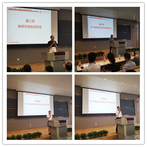 赵斌副教授代表学院全体教师发言,他向大家分享了自己在学习和研究方面的一些心得,主要从“怎样做一个合格的研究生”“要做怎样的研究”“如何做一名有情怀的研究生”这三个方面,为大家提供了宝贵的经验和建议。2018级研究生代表郝敏同学分享了研究生生活的体会和感悟,她强调“奋斗是青春的底色”“学习和科研是研究生生活的主旋律”。2019级新生代表段嘉婷同学和大家分享了军训的收获和感受,并呼吁同学们“作为新交大人,一定要立足当下、志存高远”。2019级研究生代表石凯中同学对创新港的研究生生活充满了期待,他强调“创新港给予了交大新生无限的可能,同学们一定要通过自己的努力把可能变成现实”。