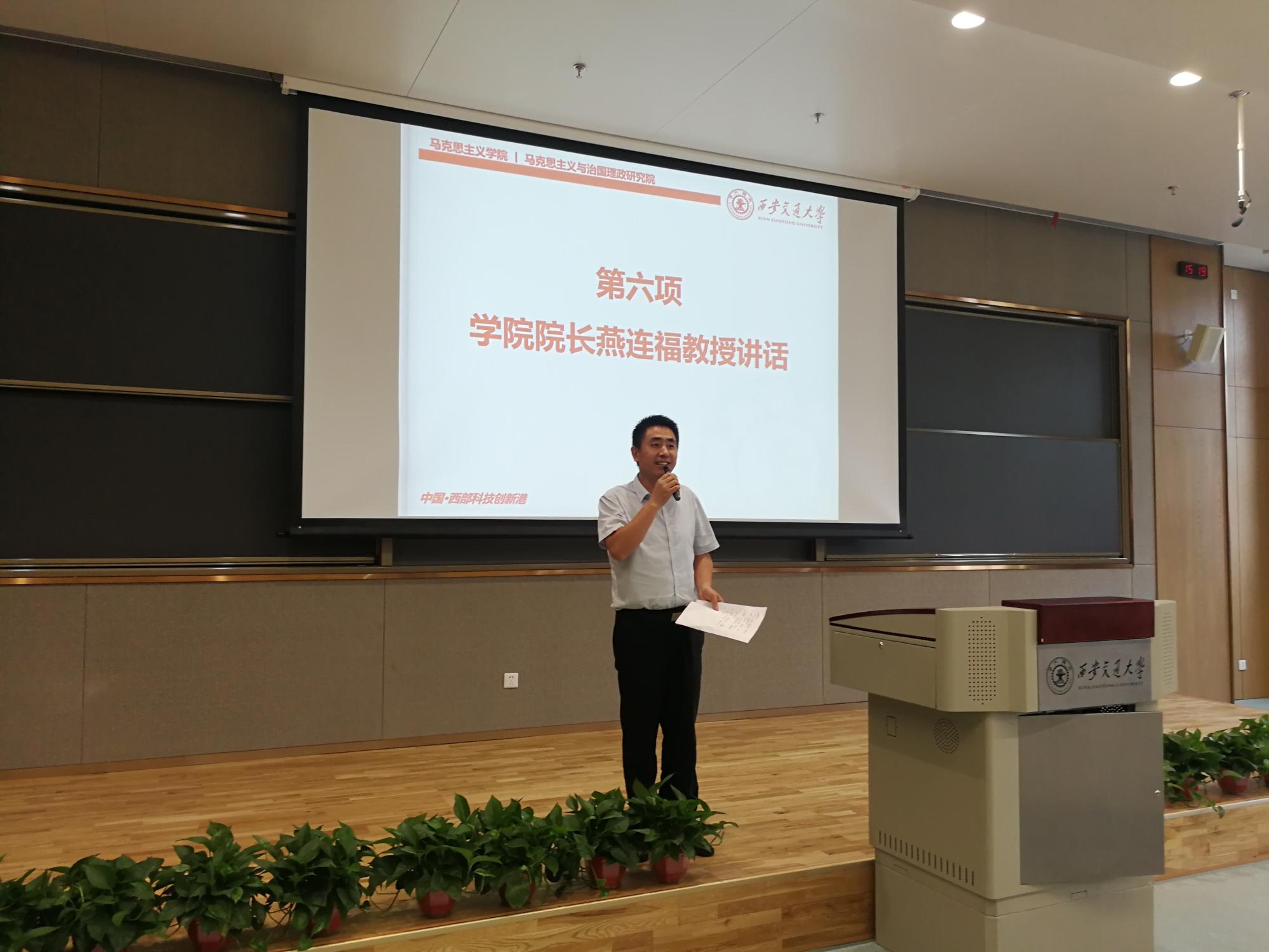 的成长和发展史,指出交大马院一直处于全国马院的第一梯队和第一方阵,同学们要传承好历史递交的火炬,把西安交大马院的火炬燃烧得更加光明和灿烂。其次,他强调同学们一定要努力学习,如此才能不辜负马克思给我们的重托、不辜负习近平给当代青年的重托、不辜负张迈曾书记在马理论91班交流会上的重托、不辜负父母和老师们的重托。最后,他希望并相信同学们能够在创新港这个新的平台上创造新的未来、取得新的成绩,建议同学们要时时争先、事事争先、人人争先,以世界一流的目标来要求自己。