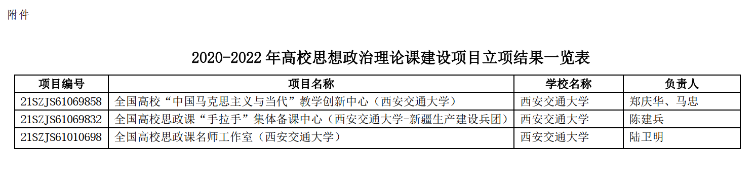 12月1日,教育部“关于2020-2022年高校思想政治理论课建设项目”立项网上公布,由郑庆华副校长和马忠教授负责的“全国高校‘中国马克思主义与当代’教学创新中心”、陈建兵教授负责的“全国高校思政课‘手拉手’集体备课中心”、陆卫明教授负责的“全国高校思政课名师工作室”三个项目获批立项。立项数量同复旦大学并列全国高校第一。