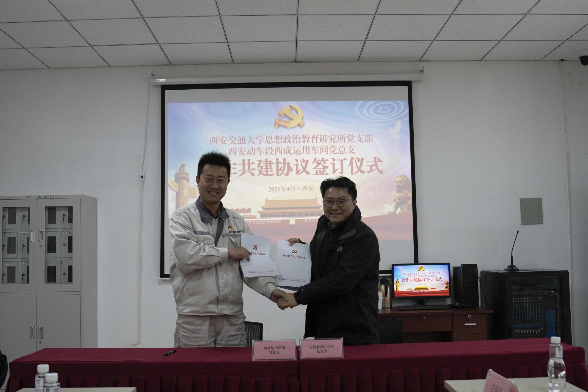 思想政治教育研究所党支部与西安动车段西成运用车间党总支签订合作共建协议。