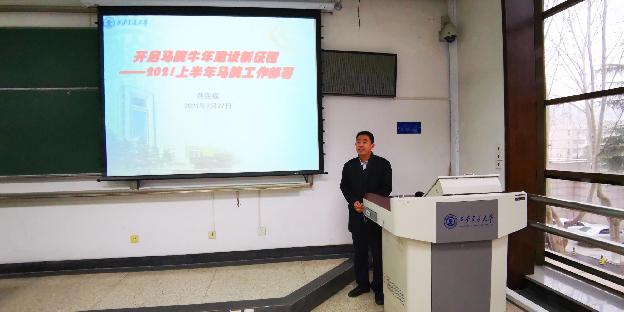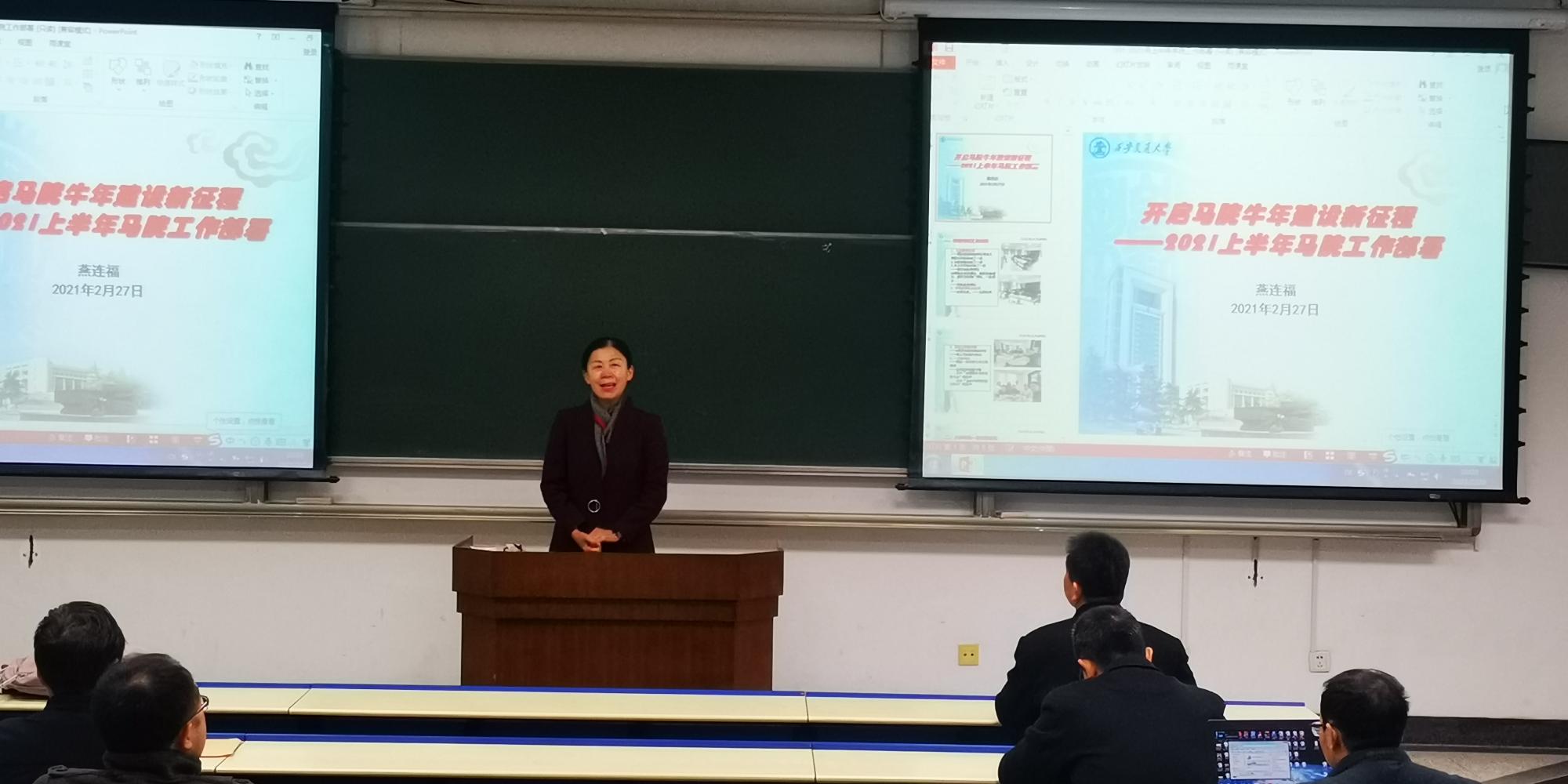 燕连福院长通报了寒假期间学院在课程建设、国家社科基金申报、安全稳定等方面的情况,并分析了学院未来发展的问题清单。他要求,学院新学期要围绕继续办好、讲好思政课的核心任务以及迎接建党100周年、迁校65周年等两项重点任务,上下同心、尽锐出战,提早谋划、补齐短板、提高质量,做好开局之年各项重点工作,在“十四五”做出更多的成绩。