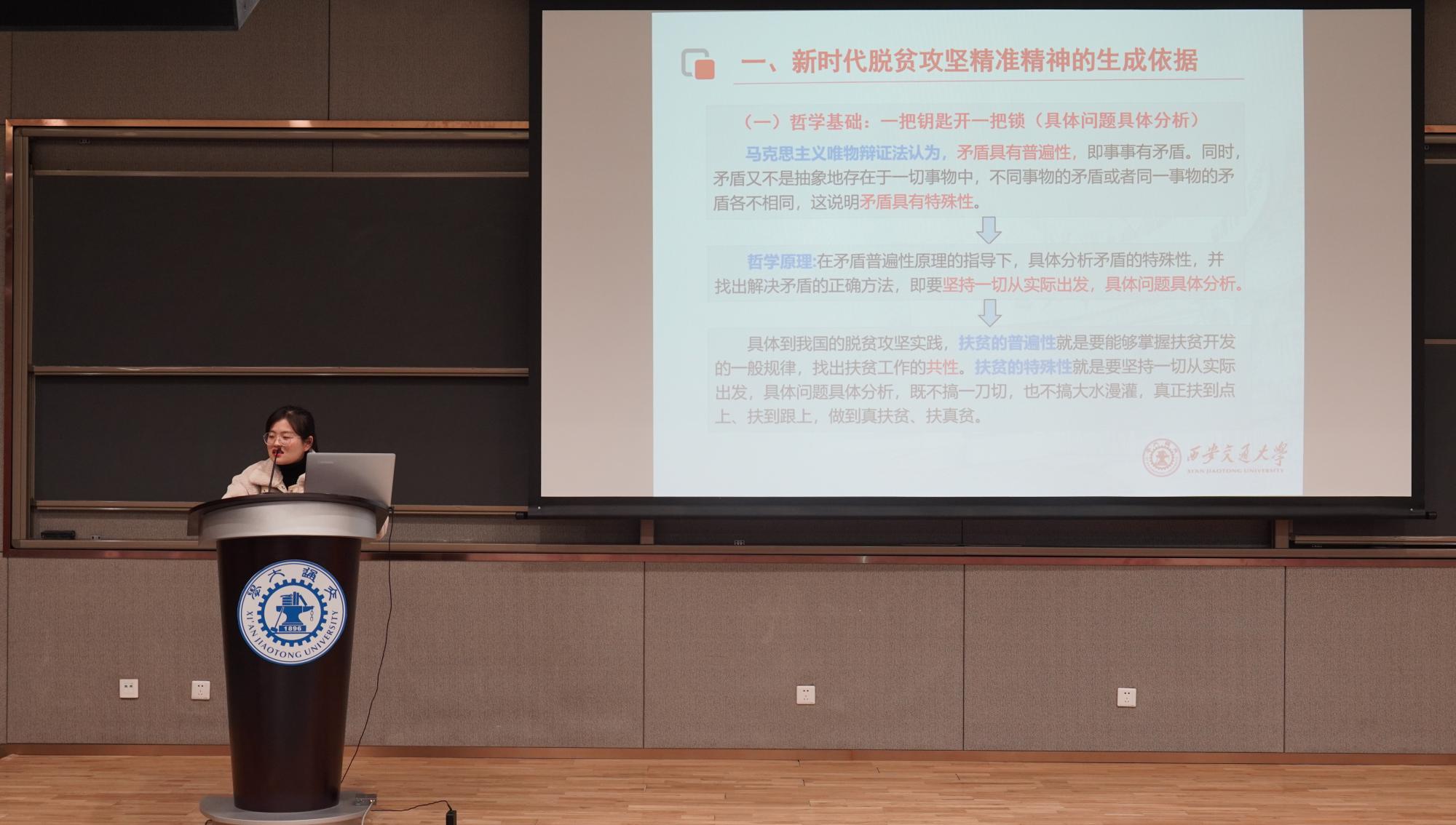 王亚丽从新时代脱贫攻坚精准精神的生成依据、核心内涵、实践路径三个方面进行了报告。她提出新时代脱贫攻坚精准精神的内涵有四点:一是精准识别,把扶贫对象找出来(扶持谁);二是精准选拔,打造一支能征善战的扶贫工作队(谁来扶);三是精准施策,全面拔掉“穷根子”(怎么扶);四是精准退出,确保贫困群众真正脱贫(如何退)。