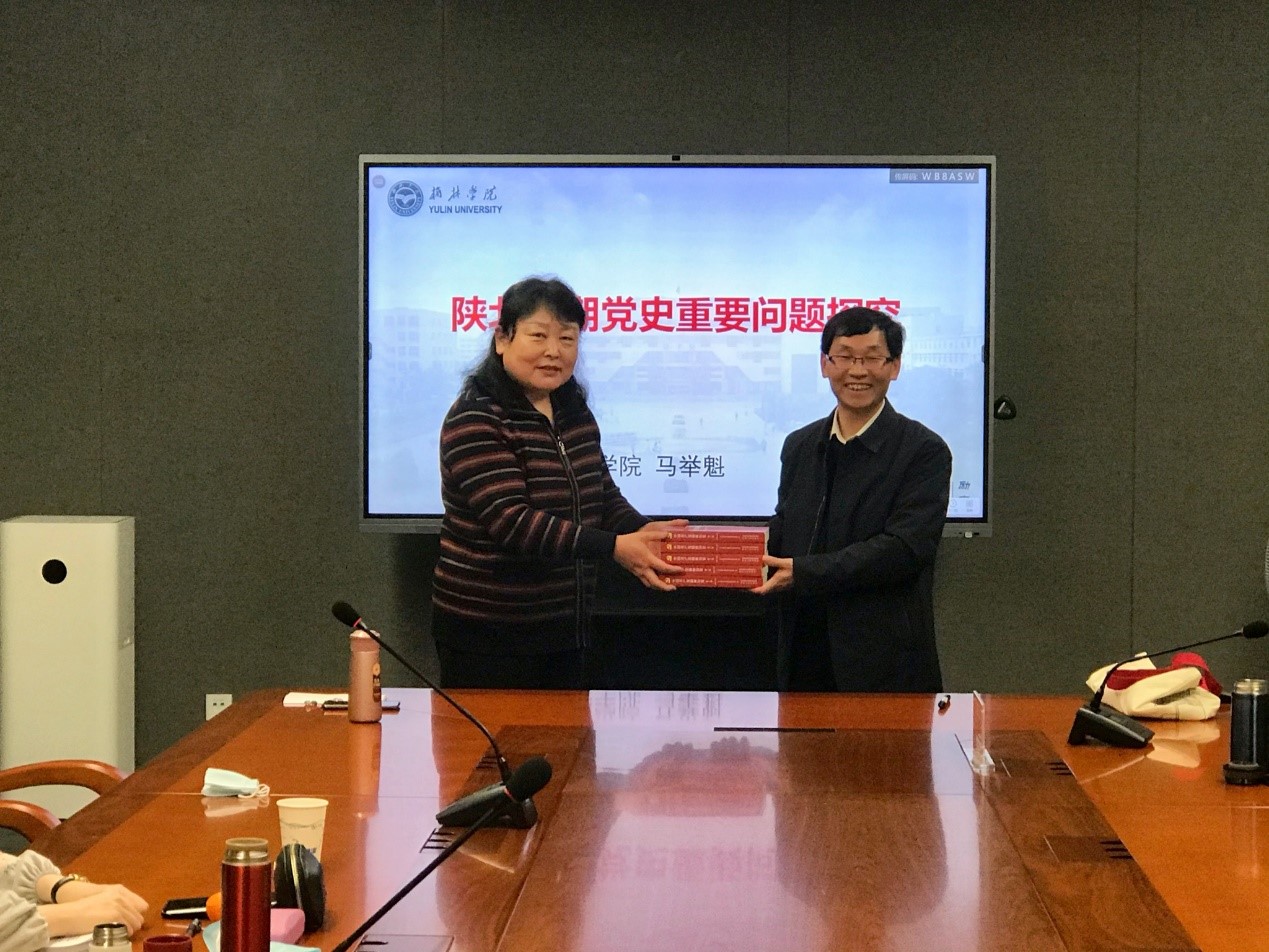 在讲座开始前,双方举行了赠书仪式。马举魁教授向西北革命史研究中心赠送了《中国共产党榆林历史(第二卷)》,马金玲教授回赠了中心研究员撰写的学术专著。