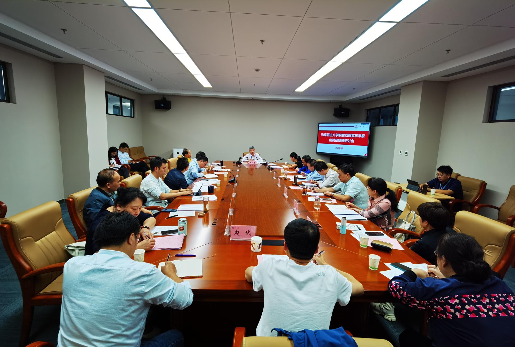 会上,苏玉波汇报了学院各系所、党支部开展学习科学家座谈会精神以及学院“十四五”规划编制情况,陈建兵教授、刘儒教授、马忠教授、杨华副教授、陆卫明教授、樊晓燕副教授、马金玲副教授分别汇报了习近平新时代中国特色社会主义思想概论课研究中心、陕西省中国特色社会主义理论体系研究中心、政治经济学研究中心等12个研究平台的建设情况以及“十四五”期间重点工作的思路。