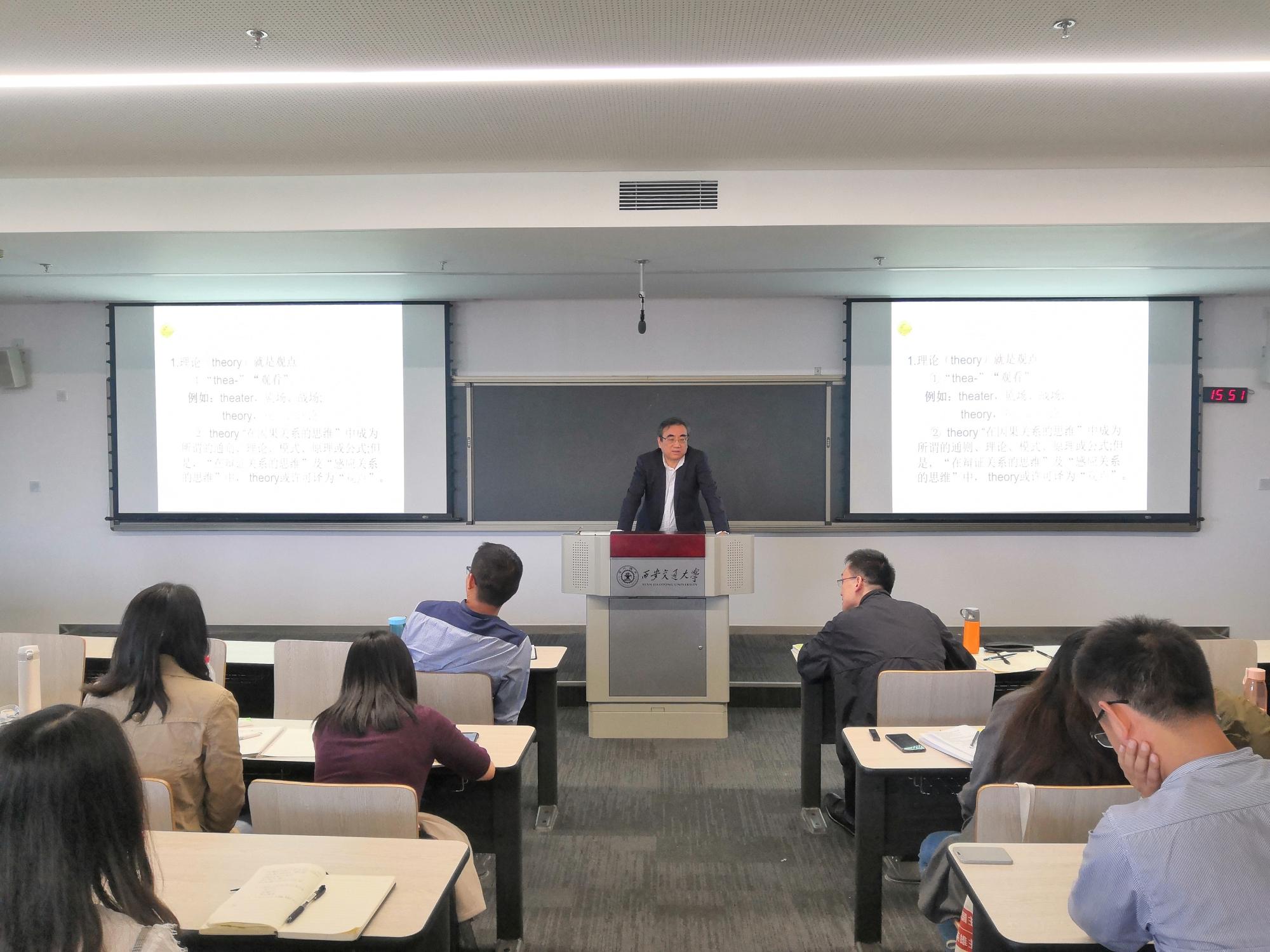 宋进教授主要从问题意识、问题的研究方法以及创新视域三个方面展开讲述,并结合自身多年以来的学术研究经验深刻阐述了马克思主义理论研究问题和方法。宋进教授强调硕士生、博士生在构建一篇论文的时候首先要树立问题导向、问题意识以及问题逻辑,并举例说明问题意识中三个重要的特征,即客观性、预设性和批判性,这对于我们进行理论研究起到关键性的一步;其次,宋进教授通过实例论证了学术研究方法必须与学术论文的写作过程相结合,并进一步强调了国际视野和历史逻辑的重要性。最后,宋进教授指出,近年来博士论文的研究方法有趋同化的趋势,博士生应当学会构建认识模型,优化研究路径,用横向的世界眼光及纵向的历史深度对理论研究进行深层次创新。
