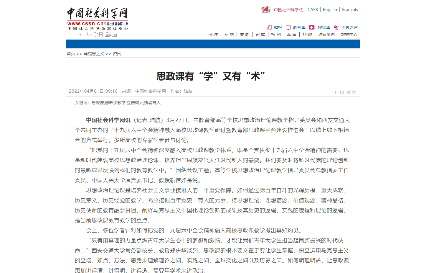 与会学者一致表示,思政课不仅有“学”,又有“术”,要进一步提高思政课的思想性、理论性、针对性、亲和力,通过教学把党的创新理论转化成学生强大的思想动力。