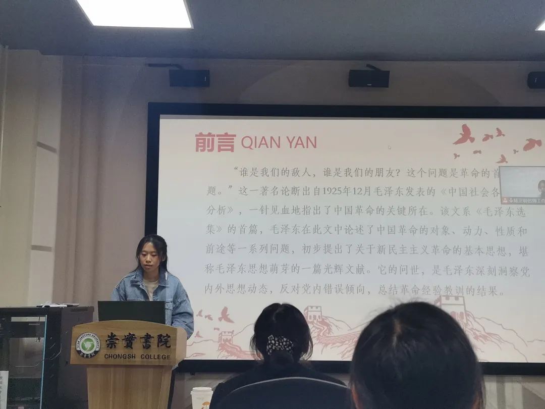 大三年级的段嘉婷是马理论专业的优秀学生,也是一名光荣的中国共产党员。她为大家精读《毛泽东选集》的开篇《中国社会各阶级的分析》,以该文的写作背景、主要内容和现实意义三个方面为切入点,配以原文选段和精致的思维导图,以细腻的视角具体评述毛泽东在国民大革命时期对中国各社会阶级在中国革命中地位、作用的分析,剖析“没有调查就没有发言权”等科学的研究方法,带领同学们开展了一场精彩充实、简明易懂的毛选精读。