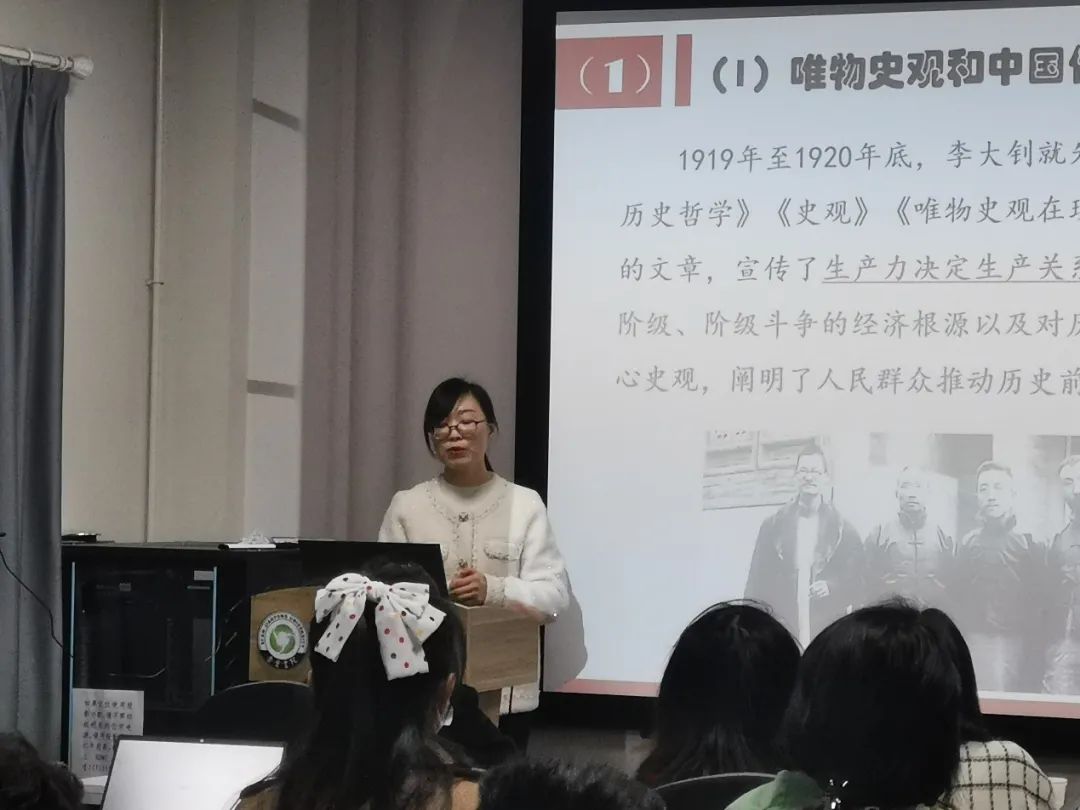 曹芳副教授首先做题为“马克思主义和中华优秀传统文化的契合性——以五四时期先进知识分子接受马克思主义为例”的专题讲座。曹老师从“两个结合”的缘由谈起,围绕马克思主义中国化主线,为我们解读了五四时期一批先进的知识分子选择马克思主义作为引导中国革命的指导思想的深层内因,深刻剖析了马克思主义与中华优秀传统文化的契合性,包括唯物史观与中国传统历史观的融合、阶级斗争学说与中国传统革命思想的融通、科学社会主义愿景与中国大同社会理想的融会、实践理性等深层文化心理结构的贯通。曹老师旁征博引,深入浅出,多次援引马克思、恩格斯等经典,讲解中华优秀传统文化的哲学智慧,剖析了李大钊等中国共产党早期代表人物对于马克思主义认识的过程,以大量生动的叙事为古今中外的伟人穿针引线,寓深刻于平实之中,让同学们接触到了历史人物的另一个侧面。