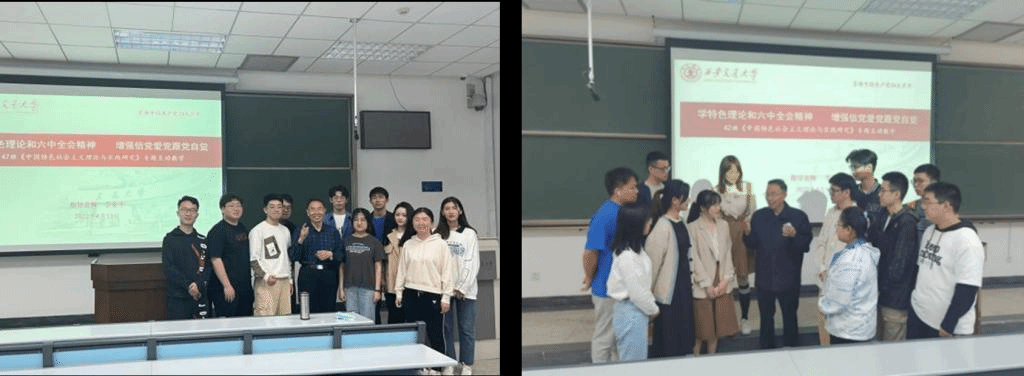 42班第六组杨鑫同学以“‘两个确立’的理论逻辑历史逻辑和现实逻辑”为题汇报了学习体会;第二组魏子铖同学在做题为“弘扬伟大建党精神与西迁精神,争做有志气、有骨气、有底气的新研究生”的分享;第三组杨朔同学以“从世界各地区国家信党爱党跟党自觉”为题了自己的学习收获;第五组潘丽同同学从自身的生活出发,用心感受中国共产党的领导是将人民的根本利益放在首位的,并体会到“西迁精神”是交大学子生生不息的精神养料,不断思考如何弘扬“西迁精神”做有志气研究生,鼓舞着交大人不断地开拓创新、锐意进取。