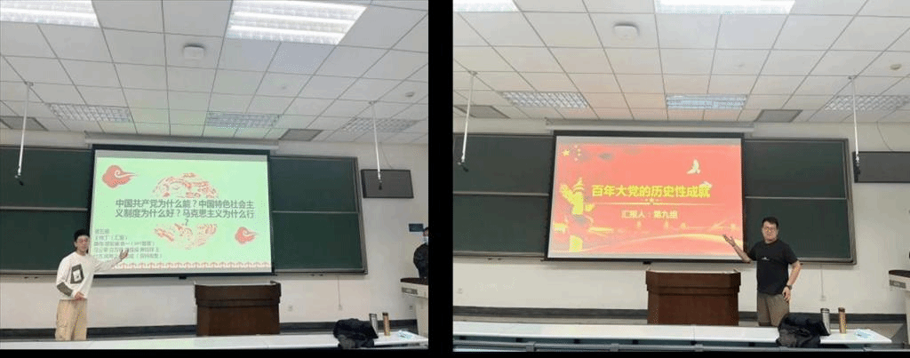 在专题交流环节,各组同学准备充分,结合理论,立足现实,汇报内容精彩纷呈。47班的第一小组成员分享了担任疫情防控志愿者的真实经历,第二组对比了中美等国在面对疫情的不同选择,第四组从两种社会制度“孰强”的争论出发进行探讨。第三组和第七组学习了党的十九届六中全会通过的《中共中央关于党的百年奋斗重大成就和历史经验的决议》,分享了马克思主义中国化的“三次飞跃”的历史和现实意义。第六组、第八组、第九组和第十组学习百年党史,分享了百年大党的历史性成就、十个历史经验和党四个时期主要任务及其历史地位,达到了学史明理,学史增信,学史崇德,学史力行的效果。第五组探讨了中国共产党为什么“能”、中国特色社会主义制度为什么“好”、马克思主义为什么“行”,同学们在讨论中深刻领会了马克思主义的先进性,以及中国共产党是为中国人民谋幸福的政党,也是为人类进步事业而奋斗的政党。