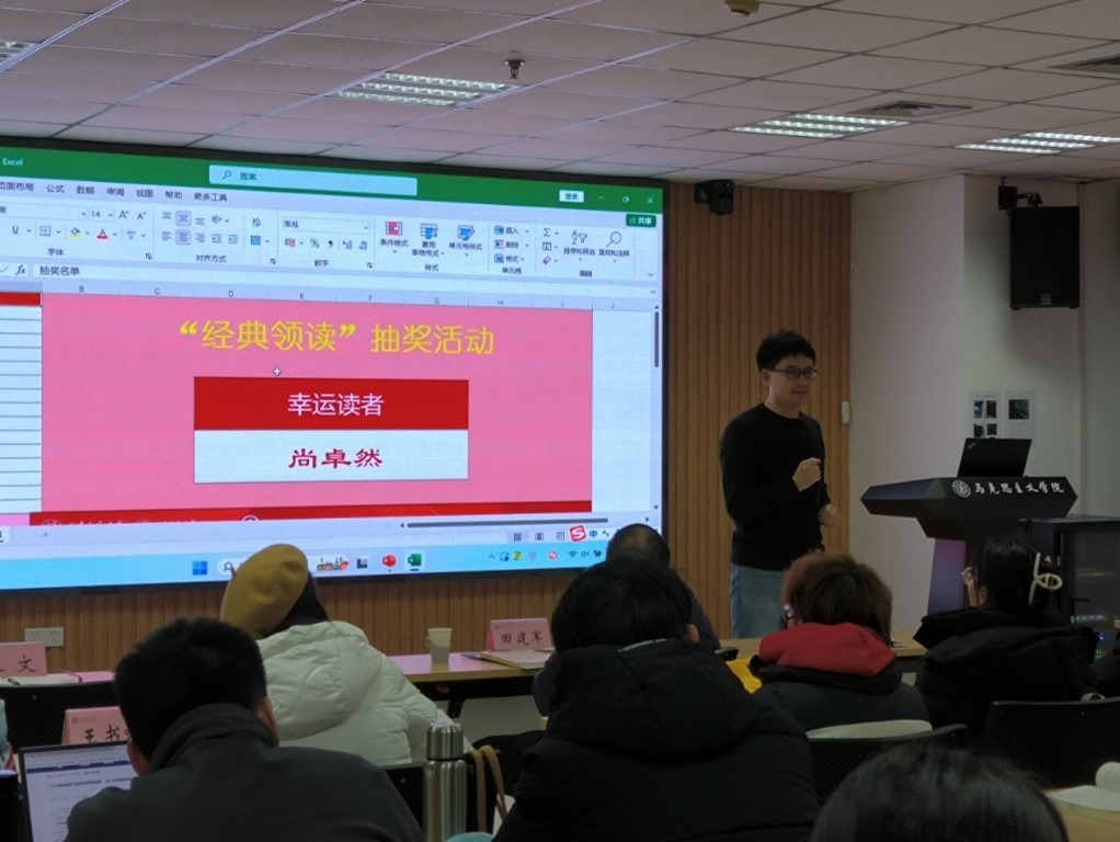 主题讲座结束后,张文老师进行了简要总结,他指出“经典领读”活动是学院学生课外学术活动的重要内容,马列读书社要通过持续举办此类活动,培养同学们阅读经典的兴趣和习惯,通过阅读经典提升学术研究能力。活动最后,由王书吟老师与李宗琦老师为同学们抽取“幸运读者”并颁奖,中奖的同学可以获得《中国叙事》或《十五部马恩经典著作导读》两本书之一,共计中奖同学十五人,现场气氛十分热烈,同学们纷纷表示期待更多的“经典领读”活动。本场讲座内容详实,形式有趣,同学们学有所获,读有所获,具有培养同学们阅读经典习惯、提升学术能力的积极作用。