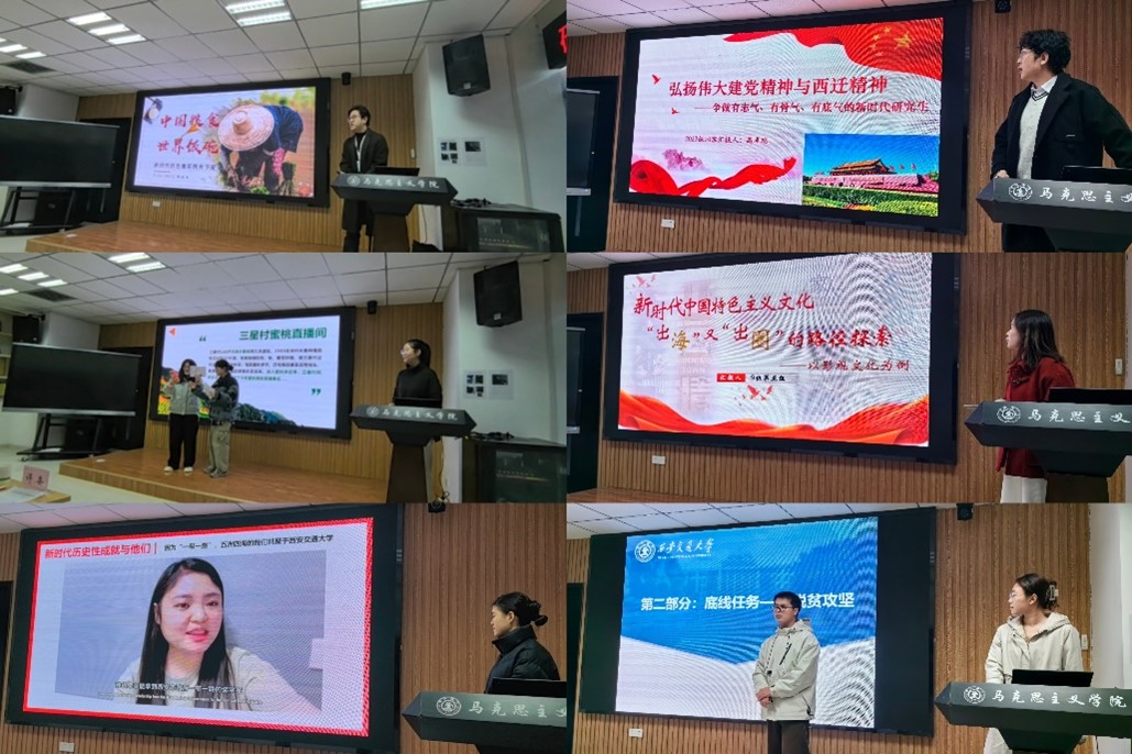 、人文社会科学学院、新闻与新媒体学院、经济与金融学院、外国语学院、公共政策与管理学院的任怡之、鲍雨欣、陈钰萍,胡江南、颜睿鸿、夏妍、庞祥毅、吕泽州、李成玉、廖芳、高卓瑞等同学,从“习近平对马克思主义哲学中国化的理论与实践贡献”“弘扬伟大建党精神与西迁精神”“乡村振兴这么干”“新时代生态文明建设发展成就”“中国粮食世界饭碗”“讲好中国故事”等方面进行了精彩展示。经评审,本次展示活动共评选出一等奖3个、二等奖7个、三等奖10个。