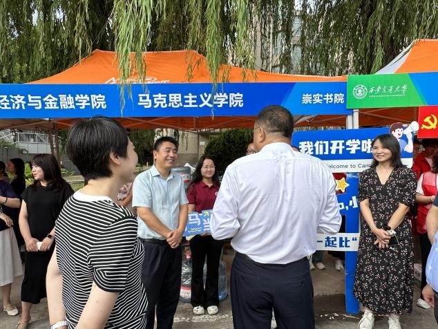 院长燕连福,副院长陈建兵,党委副书记邱辰,团委书记、辅导员梁佳艺,马理论2501班主任邓皎昱,2502班主任刘小溪,以及学生志愿者在南门迎新点轮班值守,为新生提供咨询引导、发放迎新礼包以及协助行李转运等迎新服务,以热情的微笑和清晰的指引迎接每一位新生。