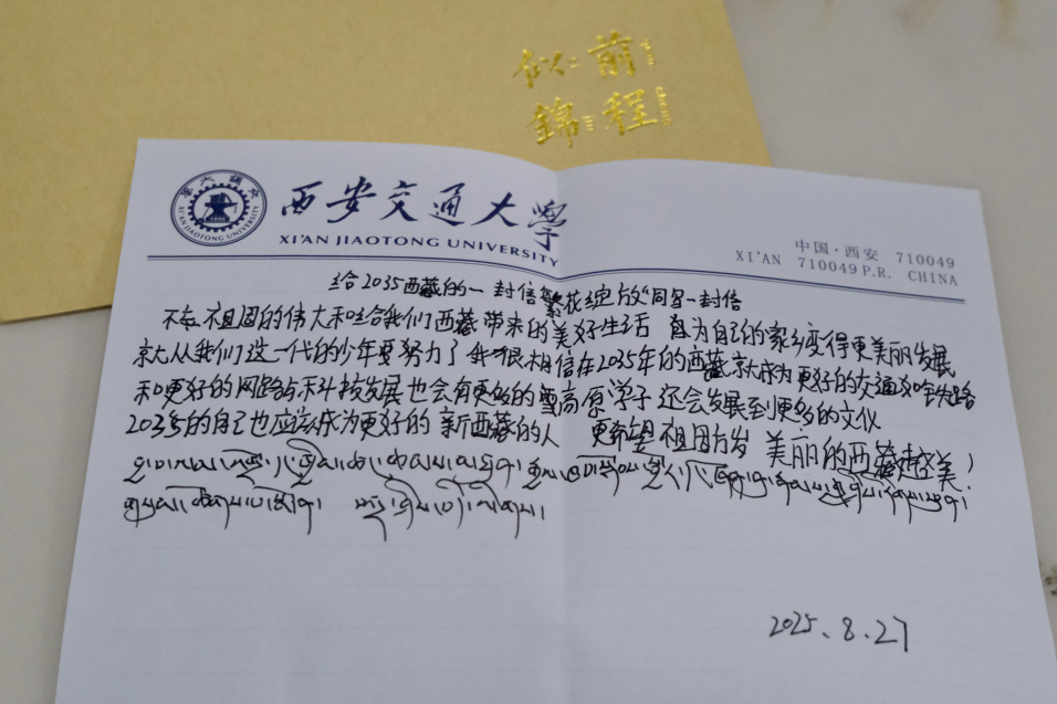 “给2035西藏的一封信”书信活动中,同学们以纸笔书写未来。教室里静谧庄重,同学们畅想西藏未来的交通、生态与教育发展,也思考如何将个人理想融入家乡建设。字句之间,蕴含着同学们对祖国的深切热爱与对新时代的坚定回应。这既是对同升一场旗、同种一棵树、同唱一首歌、同跳一支舞、同比一场赛的深刻总结,更是一堂鲜活而厚重的理想信念教育课,充分展现出西藏青年宽广的视野和强烈的责任感。同学们在信中写道:“祖国的伟大为我们西藏带来美好生活,我要努力让自己的家乡变得更美丽……祝愿祖国万岁,西藏的明天更美好!”