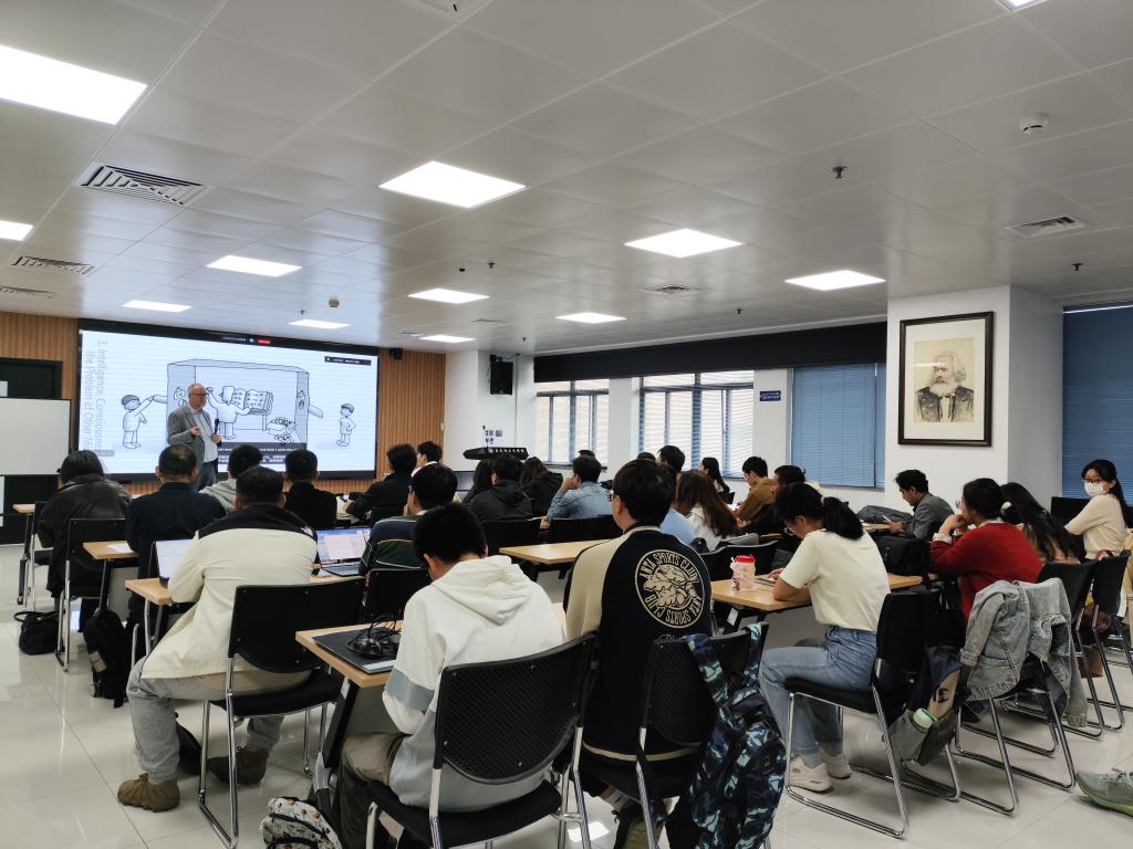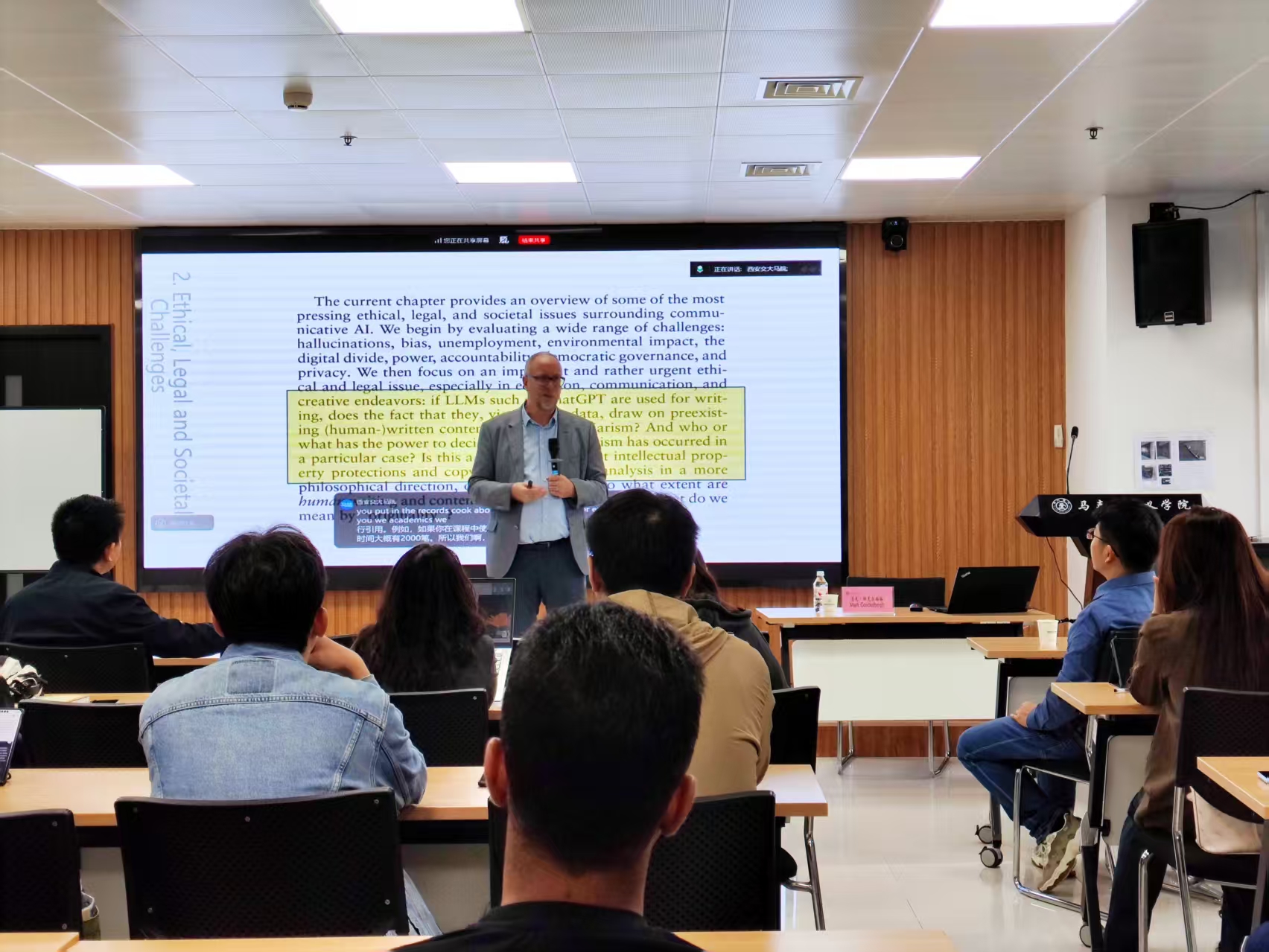 马克•科克尔伯格教授从哲学视角出发,以大语言模型(LLMs)为切入展开论述,深入剖析大型语言模型所引发的数据隐私、替代风险、虚假信息、情感依附、可持续性以及版权与抄袭等一系列紧迫伦理议题。报告认为,人工智能的发展必须确保人类与非人类的共同繁荣与公共善,这需要一种全球性与跨文化的视野。同时,大语言模型的兴起,也呼唤我们开拓创造力与意义生成的新图景。随后,与会师生与马克•科克尔伯格教授进行了互动问答和深入交流。