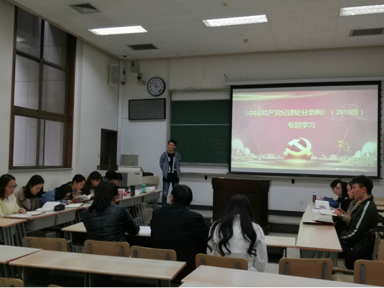 会议伊始,刘阳科同志带领大家共同学习新修订的《条例》。他从《条例》的修改历程、时隔三年再次修改的原因、此次修改后的变化以及如何贯彻落实新版《条例》等四个方面进行阐述,并在讲解中结合具体事例,对《条例》做了系统生动的介绍。之后支部成员进行了分享交流,黄佳慧同志从“四个意识”入手谈了自己的看法,认为党员必须提升理论能力,做明白人,从大局出发,服务群众。郭玉杰同志着重谈了关于政治意识的看法,提出党员必须要有坚定的理想信念,不搞两面派。万媛同志则从自身入手,认为学生党员应该加强理论学习,并将其深化于内心,将理论付诸于实践。
