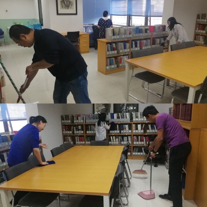 资料室进行卫生打扫和资料整理活动,以实际行动落实创建文明校园、庆祝新中国成立70周年,在大家的一并努力下,资料室焕然一新,为充分利用学院图书资源开展教学科研活动创造了良好的环境。