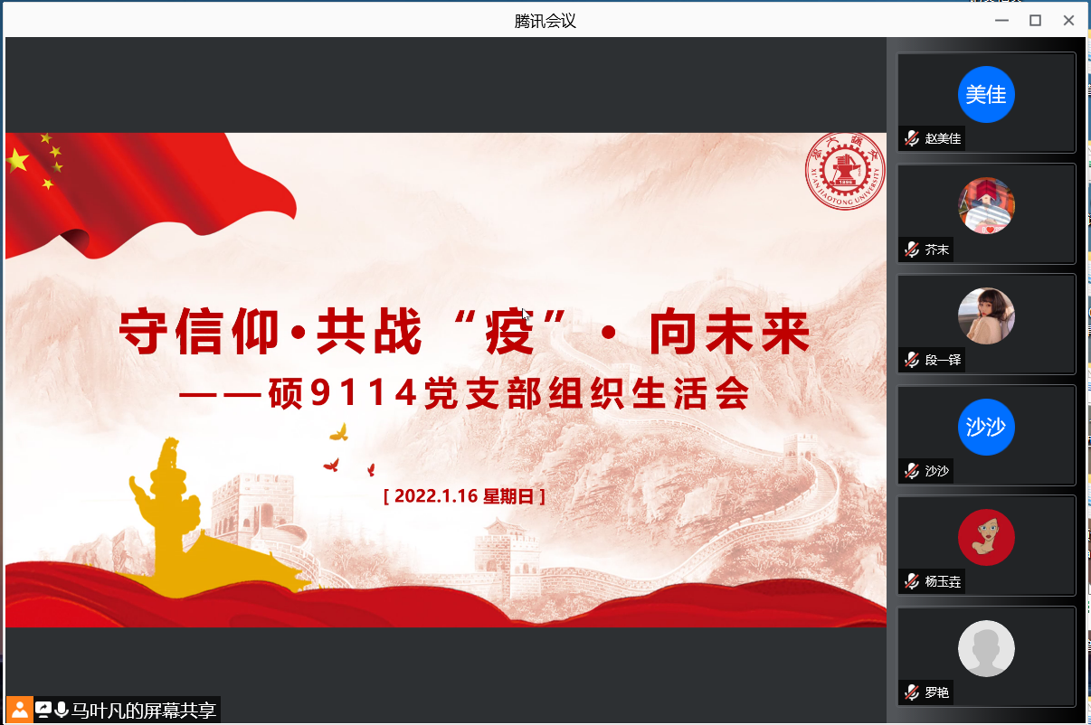 硕9114党支部召开线上组织生活会,就“守信仰·共战‘疫’· 向未来”主题展开学习和讨论。会议由党支部书记马叶凡同志主持,支部全体党员参加。