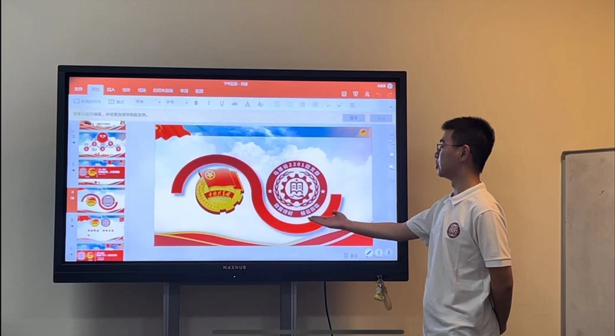 班徽通常是整个班级的精神的提炼,反映了大家的共同追求和共同的归属感,是班级活力和荣耀的象征,科创委员李子炎同学向大家详细介绍了马理论2201班的班徽。班会的最上方是班团支部的名称:马理论2201团支部,下方是班委对同学们的寄语:敛翼待时,候云而动,语出《晋书》,希望大家能够在未来的四年厚积薄发,成大才,担大任。班徽上的麦穗象征着农业、农民,齿轮象征着工业、工人。二者结合在一起,寓意着工农联盟,象征着马理论2201的学生永远和人民群众站在一起。中心的书本,代表着理论知识,书本下方的绶带像一条蜿蜒曲折道路,尽管道路曲折,但我们坚信前途一定光明。同时,书本的形状像字母M,代表着我们的专业马克思主义理论。书本上方的红星,象征着党的领导,代表着马理论学生永远心向党,永远跟党走。