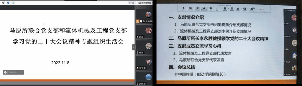 11月8日下午,马原所联合党支部和流体机械及工程系党支部线上召开学习贯彻党的二十大精神专题组织生活会。会议紧扣主题,聚焦深入学习宣传贯彻党的二十大会议精神,紧密结合党员学习实际进行分享交流,进一步增强支部成员对党的二十大会议精神的领悟,会议由马原所联合党支部书记樊晓燕主持,能源学院副院长孙中国教授等四十余人出席会议。