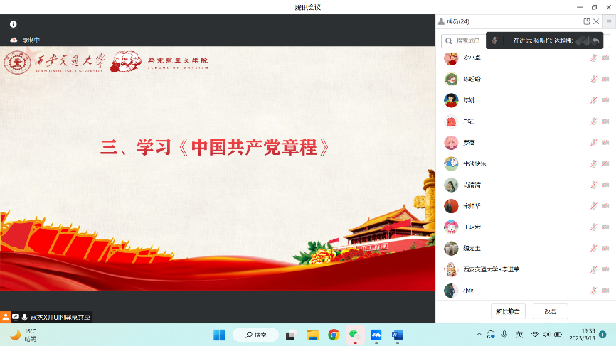 兴庆校区高年级博士第一党支部在线上召开了主题为“复盘总结促提升,砥砺前行再出发”的组织生活会。本次会议包含学习第十四届全国人民代表大会第一次会议精神、学习党的二十大报告和二十届二中全会公报、重温《中国共产党章程》、开展批评和自我批评及民主评议、发展对象汇报情况五项议程。党支部全体同志参加会议,党支部书记寇杰主持会议。