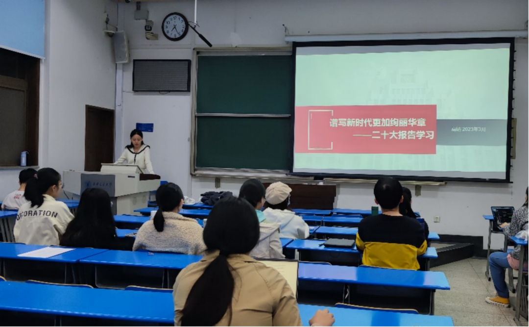 为开展严肃、认真、高效的党组织生活会,会前,硕2126党支部书记高婧带领全体党员学习领会党的二十大精神。她以“谱写新时代更加绚丽华章”为题,从百年大党迈上新征程再创新伟业、在新的伟大实践中不断谱写马克思主义中国化时代化新篇章、以中国式现代化全面推进中华民族伟大复兴、党的自我革命永远在路上四个方面展开,全面分析了党的二十大报告内容,推动党的二十大精神入心入脑。