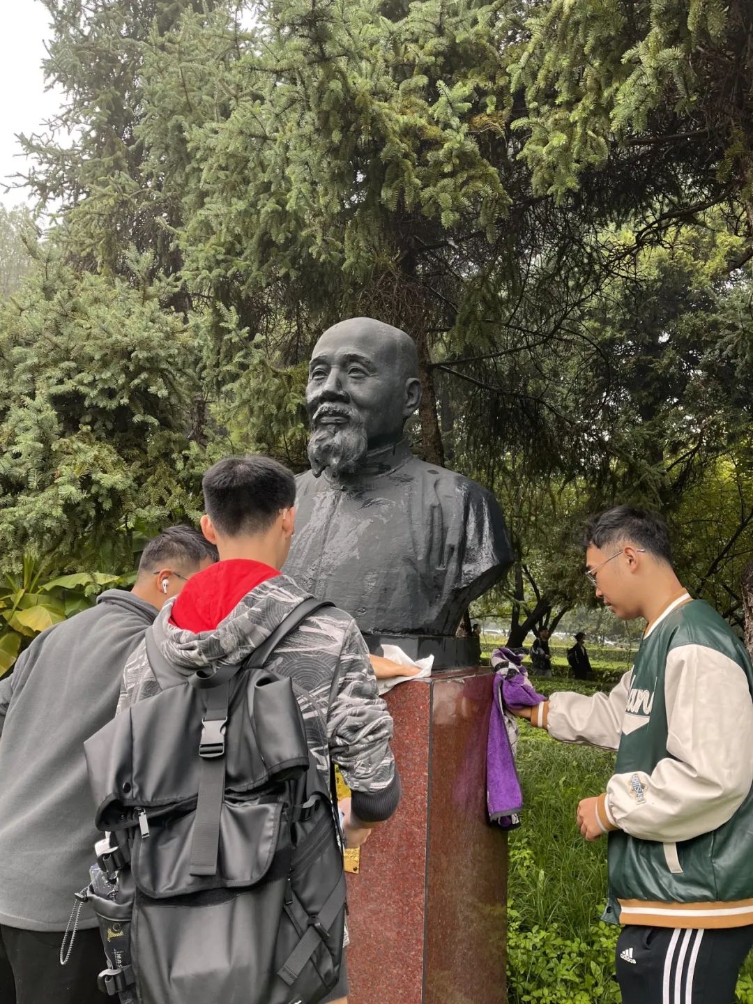 硕3128团支部组织全体成员在兴庆校区开展新学期第一次劳动包干和校内雕像清洁劳动主题活动。