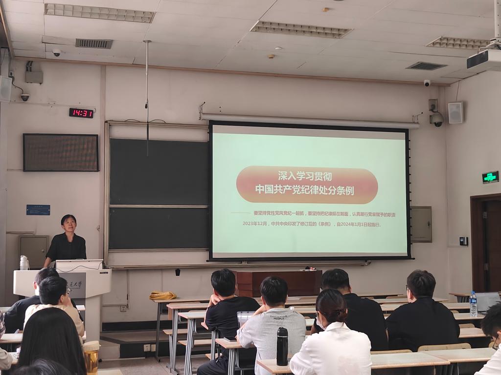 党委书记苏玉波教授走进2023级博士生党支部、硕2125党支部和硕1115支部联合开展的党纪学习教育专题组织生活会,在主B-105教室为支部党员讲授主题党课。参会各支部党员认真聆听,积极参与讨论交流,反响热烈。