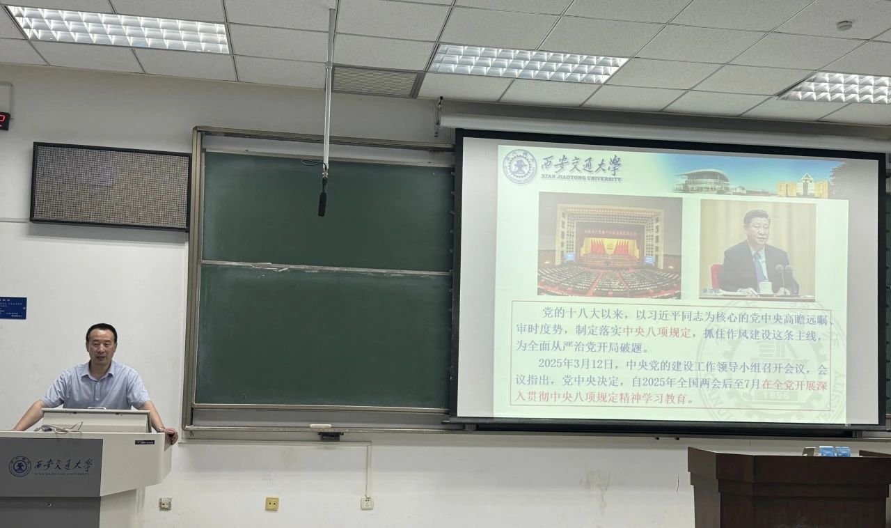 为进一步深化中央八项规定精神学习教育,着力增强党员纪律意识,推动作风建设走深走实,5月21日晚, 色情影片 硕3128党支部、硕4131党支部与 色情影片 崇实书院师生联合党支部,在主楼C-104教室共同开展“正风肃纪强党性,八项规定强根基”主题党课,学院党委委员、副院长陈建兵讲授主题党课,支部全体成员参加学习。
