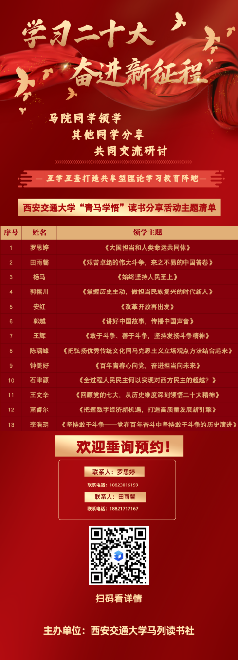 学思践悟二十大,踔厉奋发新征程。下一步,马列读书社将继续围绕党的二十大精神开展领学交流等形式多样的常态化理论学习活动,广泛宣传党的路线、方针、政策,发出时代之声、青年之声,引导广大青年树立远大理想,推动党的二十大精神走心、走深、走实,为筑牢青年思想阵地,实现中华民族伟大复兴贡献力量。