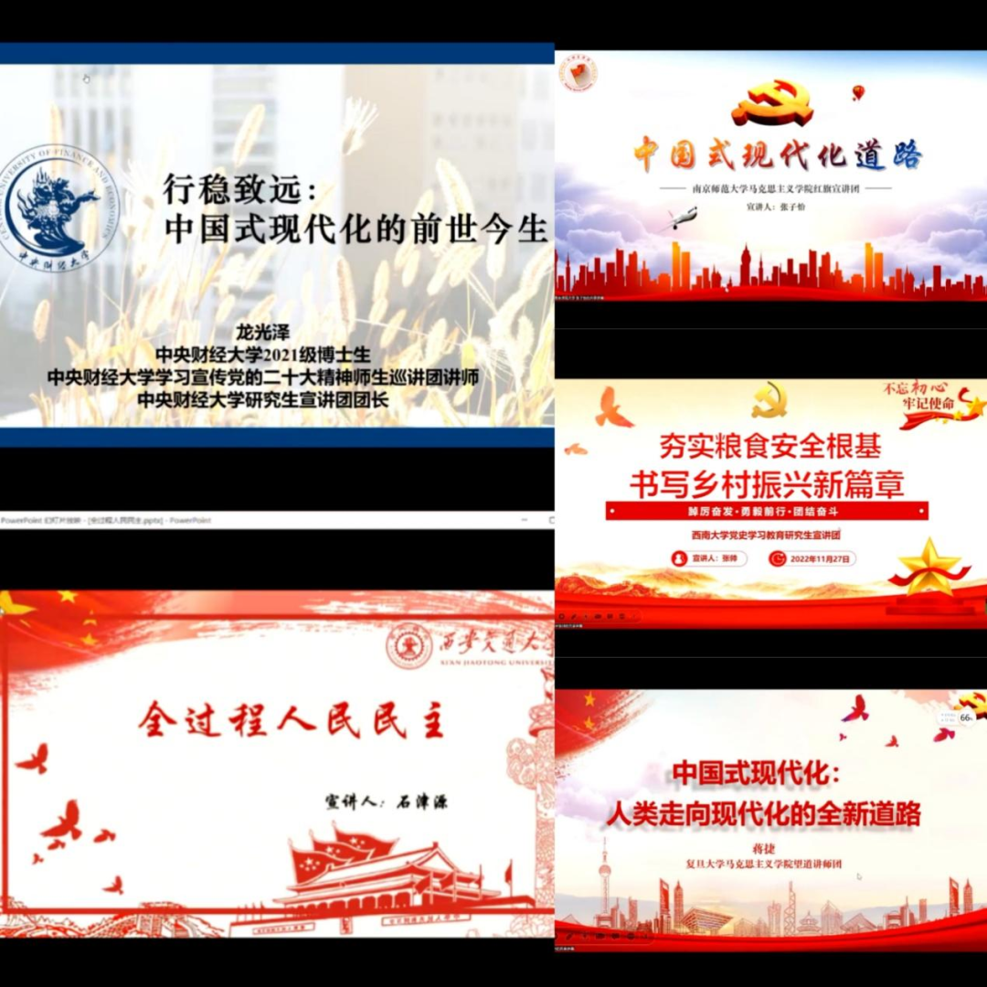 本次系列学习交流会累计举办五期,邀请来自复旦大学、南京大学、西北农林科技大学、陕西师范大学等省内外19所高校的理论学习社团参加。学习交流内容涉及党的二十大报告中提及的经济、政治、文化、社会、生态、党建等诸多领域。从“新时代十年的伟大历史成就”到“中国式现代化道路”,从“中国共产党人精神谱系”到“习近平总书记关于青年工作的重要论述”,各高校理论学习社团的领学人认真打磨领学内容、创新表现形式,充分发挥了理论宣讲直击人心、思想引领的作用,极具针对性、引领性和感召力。在第三期学习交流会中,马列读书社举办“民族团结”专题学习,邀请来自新疆大学“强国有我”大学生宣讲团、广西大学君武青年讲师团、宁夏大学凌云宣讲团和内蒙古大学“旗帜∙领航——学生理论轻骑兵”宣讲团等少数民族地区高校理论社团的领学人开展分享交流,组织学校少数民族预科班同学在线收看,促进各族青年像石榴籽一样紧紧抱在一起。