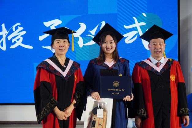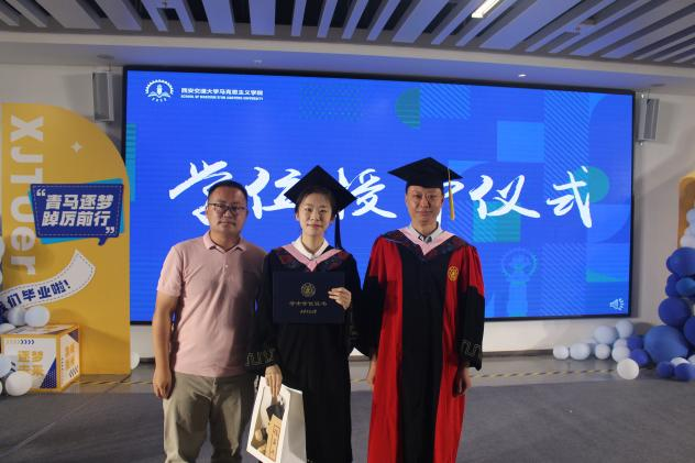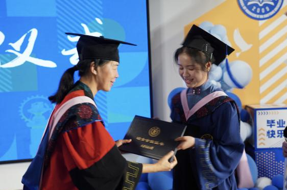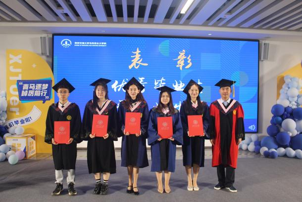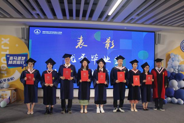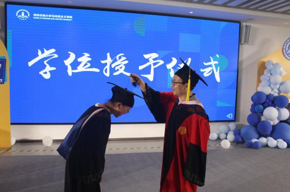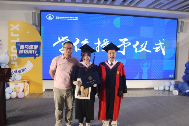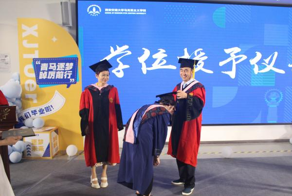 学位授予仪式环节,学院党委书记苏玉波教授,院长燕连福教授,副院长陈建兵教授、韩锐教授、梁军教授,马理论901班班主任吴鹏与毕业生导师,共同为毕业生颁授学位证书并发放纪念品。2023届毕业生依次上台拨穗正冠,这标志着他们在交大的学业已经圆满完成,即将走向更为广阔的人生舞台。