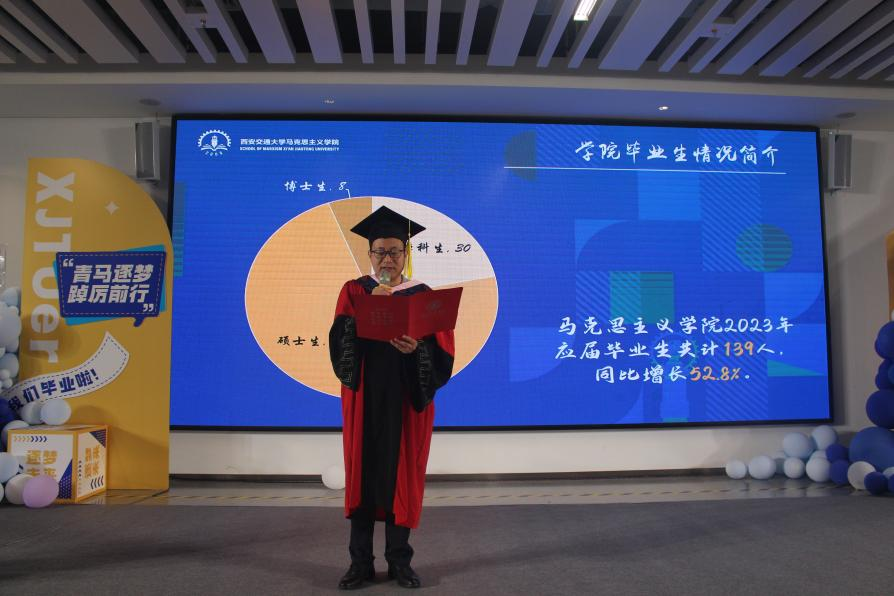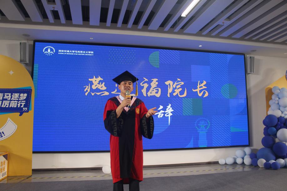 燕连福在致辞中回顾了毕业生在校期间的表现和学院近年取得的骄人成绩,感谢全体同学为学院的发展做出的贡献,希望全体毕业生牢记习近平总书记的教诲,牢记西迁精神,牢记导师教诲,在未来的人生道路上学好用好马克思主义这一看家本领。