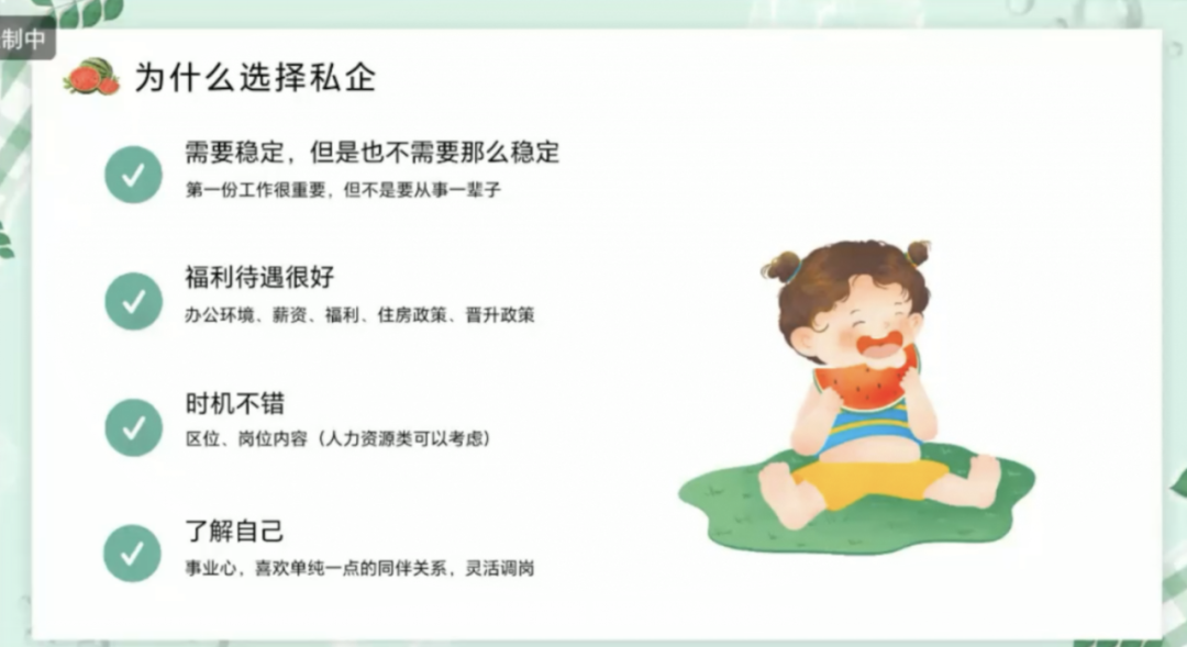 李晓婷现就职于歌尔股份人力资源本部色情影片岗,她首先向大家分享了自己选择私企的原因,以自己所在的企业为例,从办公环境、福利待遇、住房政策、晋升政策等方面向大家简要介绍了私企的整体概况,并建议大家不要过度执念于稳定性,可以着眼长远规划,灵活调整自己的就业方向;其次向大家介绍了如何进入心仪私企的方法,在简历投递、笔试、面试传统三环节之外,特别向大家强调了主动与细心的重要性;最后,在心态调试方面,她建议大家首先要正视本专业就业周期长的前置条件,在整个择业过程中放平心态,既学会为他人鼓掌,也不要怀疑自己,要坚信自己能够找到满意的工作。