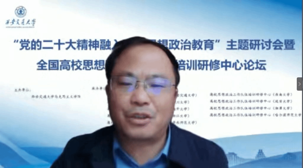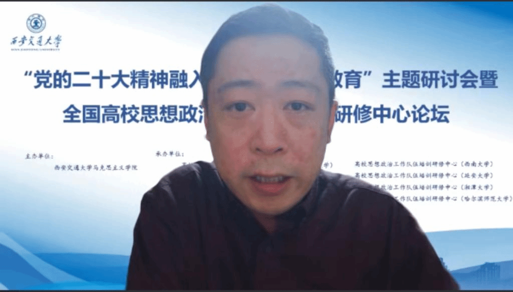 副院长杨小军介绍了湘潭大学推进党的二十大精神融入思政课堂、校园文化与社会实践的典型做法,探讨了中心在高校全面推进“大思政课”建设中的角色定位、功能作用和进一步建设思路。