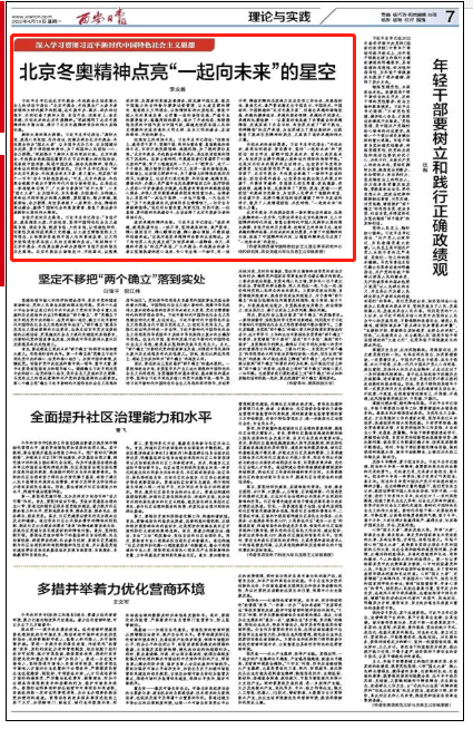 习近平总书记在北京冬奥会、冬残奥会总结表彰大会上的讲话中指出:“北京冬奥会、冬残奥会广大参与者珍惜伟大时代赋予的机遇,在冬奥申办、筹办、举办的过程中,共同创造了胸怀大局、自信开放、迎难而上、追求卓越、共创未来的北京冬奥精神。”深刻阐明了北京冬奥精神的丰富内涵,揭示了北京冬奥精神背后的伟大实践创造。