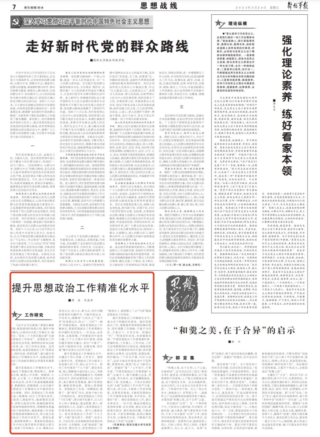提升思想政治工作精准化水平,关键在于用心用情、工作有方。要耐心教育引导。思想政治工作从根本上说是做人的工作,耐心必不可少。面对工作对象的“千人千面”,要设身处地、推心置腹地与他们谈心交心,用真心引导对方,用真情温暖对方,用真理启发对方,同时也要找准穴位、对症下药,真正解答思想疑虑、解开思想疙瘩、解除思想包袱。要细心管理服务。思想政治工作是一项精细活,需要下一番“绣花”功夫,把每个细小的工作落到实处。面对思想政治工作的“千丝万缕”,要从细节处着手,从人们关心的小事做起,通过抓微、抓小、抓细找准切入点、突破口,使思想政治工作更具现实针对性。要巧心精准发力。面对思想政治工作的“千头万绪”,不能“眉毛胡子一把抓”,没有主次、不加区别,而是要做到具体情况具体分析,力求精细、力戒“粗线条”,精准对焦、靶向发力,把思想政治工作“做到点上、做到根上”,以“巧劲”提高思想政治工作质效。