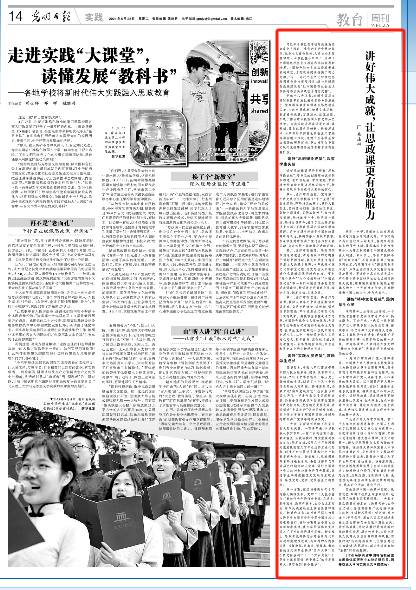 三是讲好中国人的精神面貌。脱贫攻坚,取得了物质上的累累硕果,也取得了精神上的累累硕果。广大脱贫群众激扬起奋发向上的精气神,社会主义核心价值观得到广泛传播与深入践行,文明新风得到广泛弘扬,艰苦奋斗、苦干实干、用自己的双手创造幸福生活的精神在全国城乡蔚然成风。讲好思政课,思政课教师要透过新时代跨越式发展、历史性巨变,向学生展现人民群众自信自强的精神风貌,积极打造“行走的思政课”,让学生通过实地调研、志愿服务、理论宣讲等真切“触摸”时代的脉搏。