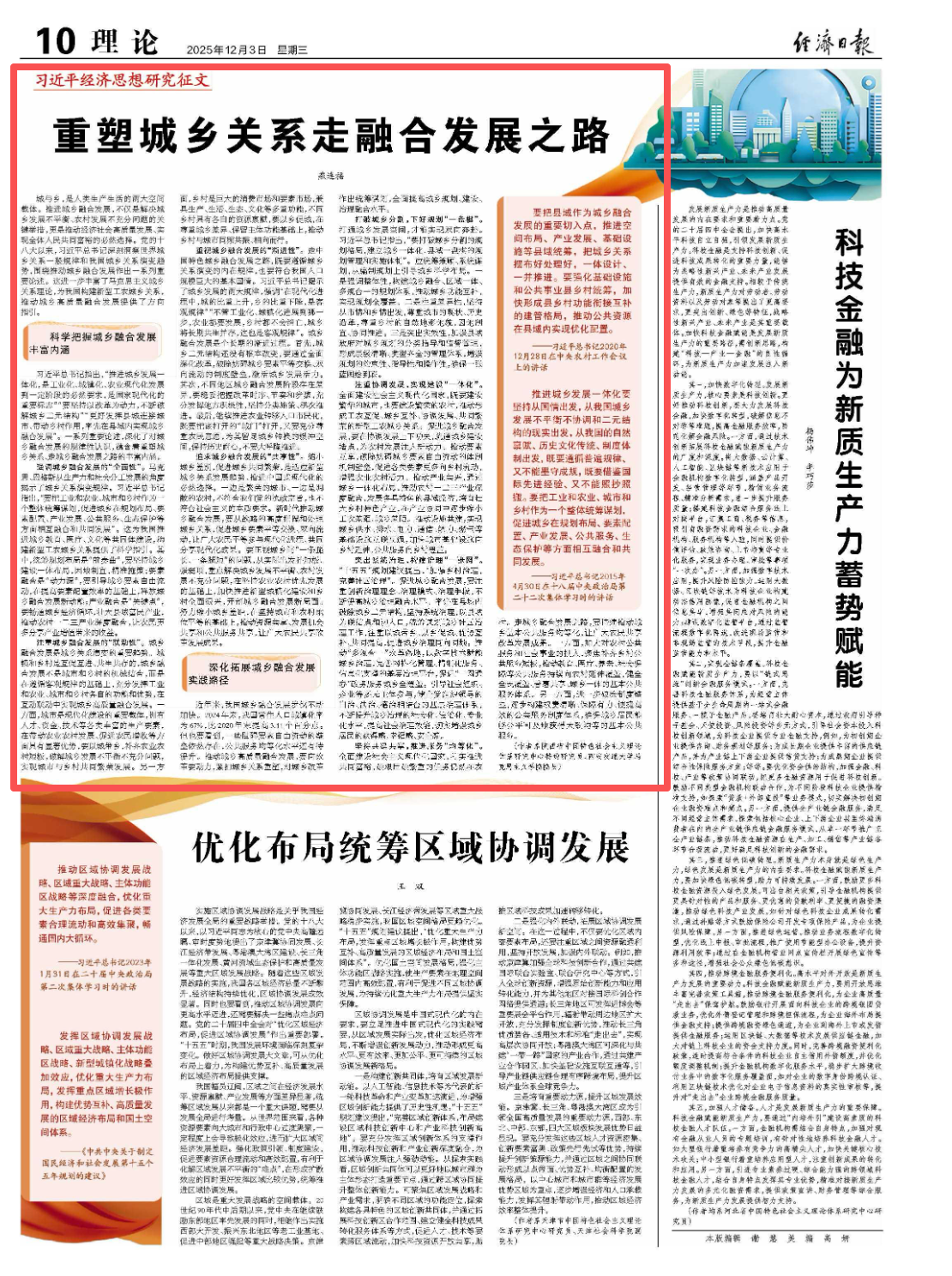 习近平总书记指出,“推进城乡发展一体化,是工业化、城镇化、农业现代化发展到一定阶段的必然要求,是国家现代化的重要标志”“要坚持以改革为动力,不断破解城乡二元结构”“更好发挥县城连接城市、带动乡村作用,率先在县域内实现城乡融合发展”。一系列重要论述,深化了对城乡融合发展的规律性认识,蕴含着重塑城乡关系、走城乡融合发展之路的丰富内涵。